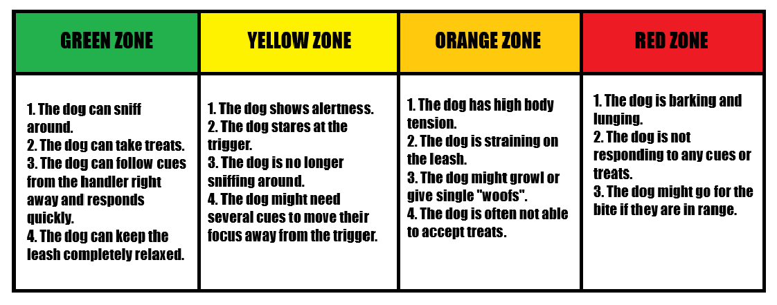Recognizing and responding to early signs of out-of-control reaction allows the handler to distance themselves from the trigger and ensure their dog is relaxed and under control. It’s essential to watch for individualized cues. Every dog has unique “tells” such as flicking one ear, tapping front paws, or a particular facial expression. Train yourself to spot those before the dog reaches their out-of-control reaction threshold so you can manage distance and apply counter-conditioning or engagement games effectively. We elaborate on this below.